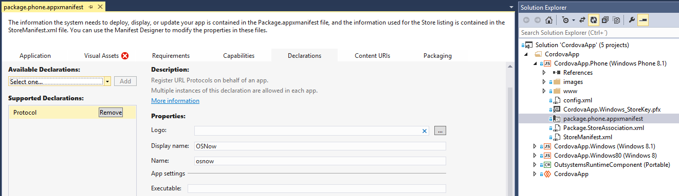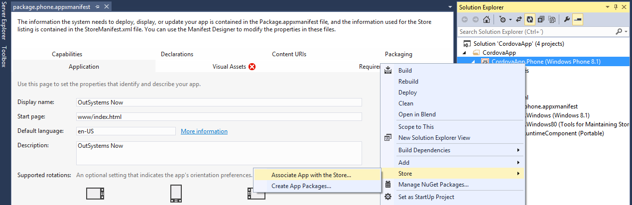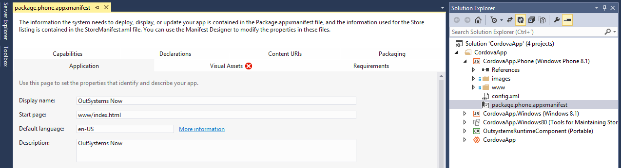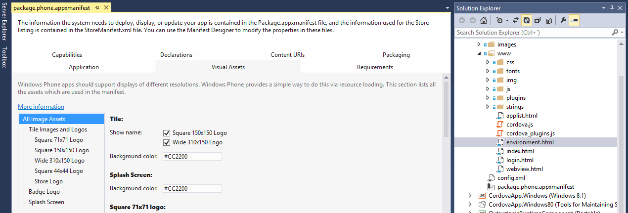 In the Solution Explorer, double-click on the appxmanifest file of CordovaApp.Phone project
